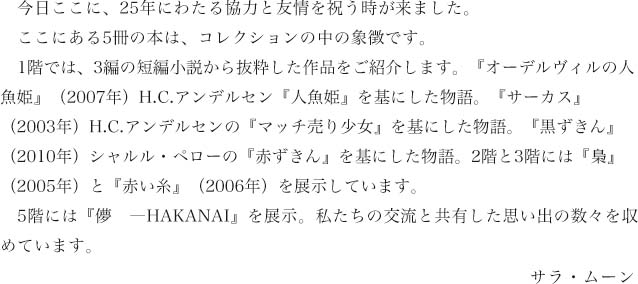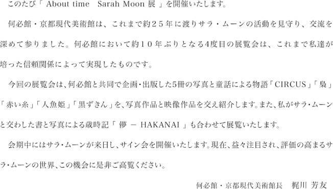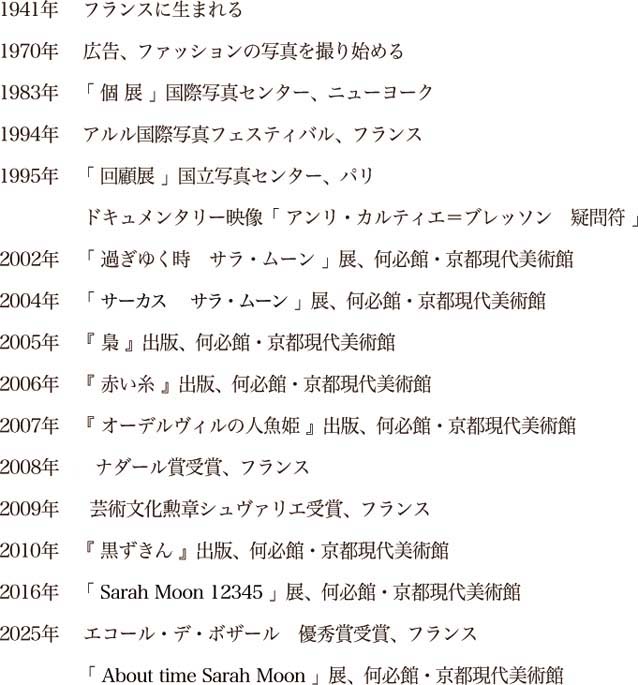 | ● 記念出版 | 「 Sarah Moon 写真集 」 7,000円 「 Sarah Moon 梟 」(DVD付) 18,000円 「 Sarah Moon 赤い糸 」(DVD付) 18,000円 「 Sarah Moon 12345 」(DVD付) 30,000円 |