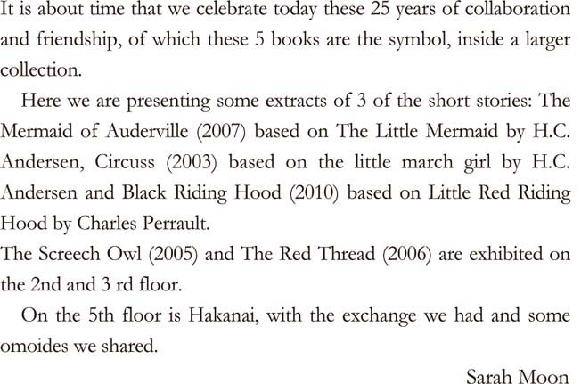 | ● 記念出版 | 「 Sarah Moon 写真集 」 「 Sarah Moon 梟 」(DVD付) 「 Sarah Moon 赤い糸 」(DVD付) 「 Sarah Moon 12345 」(DVD付) |